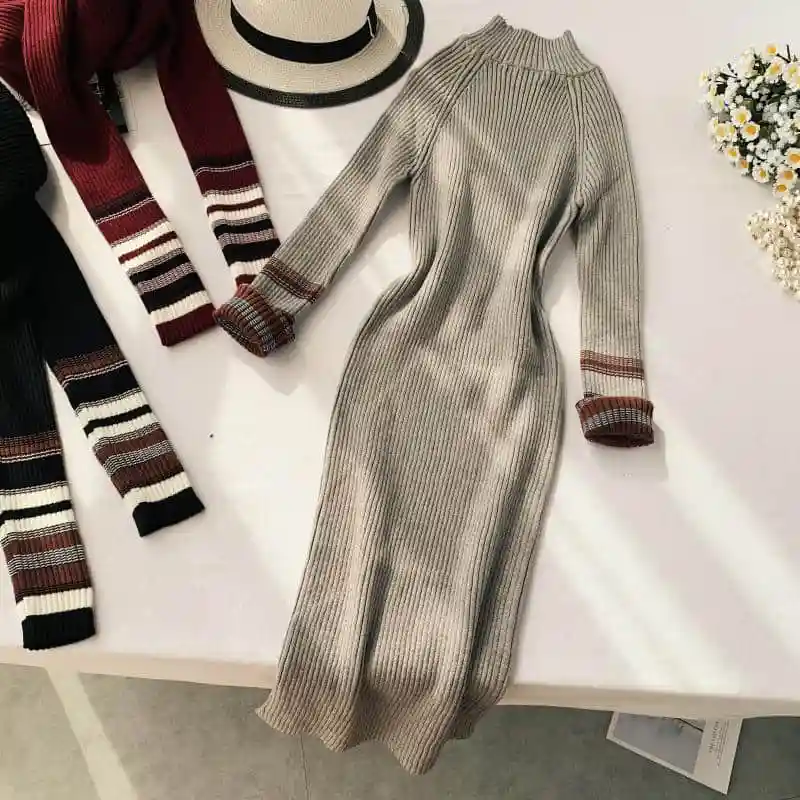 Sale 2019 autumWomen Pit Sweater Knitting Dress Long Sleeves Slim Elegant Dresses pullovers knitwear vertical stripes pit Warm Dress