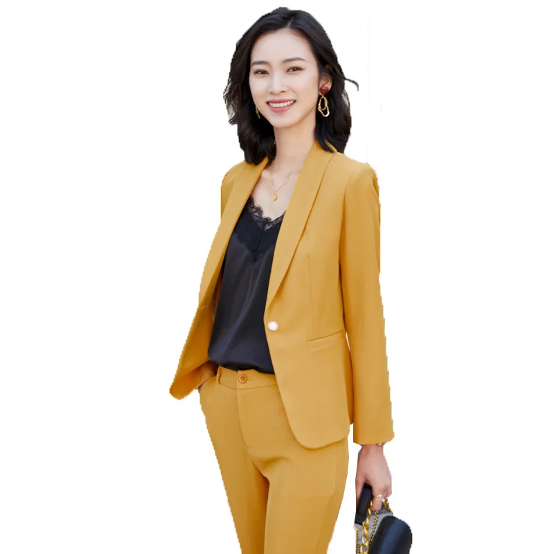 Promo Yellow Female Office Work Formal Pant Suit Women's Business Lady OL Uniform 2 Piece Set Blazer Trouser Jacket Suits Plus Size 5x