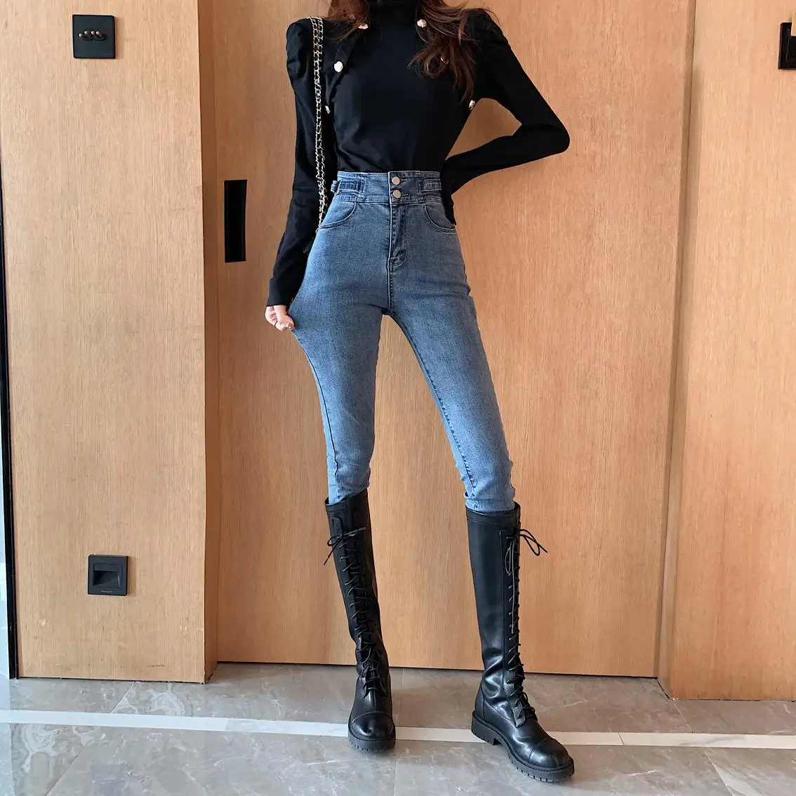 New Woman Mom High Waist Jeans Womens Skinny 2020 Spring Black Blue Elastic Jeans Pencil Vintage Denim Ladies Warm Jeans Pants